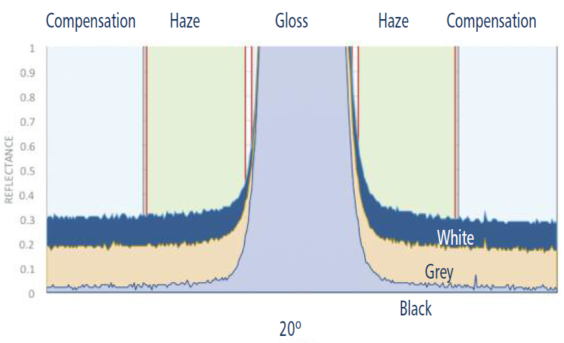 Połysk 20 °• HAZE zamglenie • REFLECTED Jakość odbitego obrazu (RIQ) • wyrazistość obrazu (DOI) • Szczytowa wartość reflektancji (rspec)
